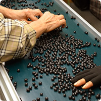 近隣農家さんから集まってきた黒豆は一つ一つ目視で選別されます。その後豆を洗い、12時間水に浸します。その豆を茹でた後、蜜漬けして再び茹でる。こうした作業を3回繰り返して、不良品を取り除いていく。これらの作業もすべて豆職人の手を介して行なうのですが、このように沢山の慎重な工程を経てようやく黒豆甘納豆「ちょっと甘いもの」として出荷されることになるのです。